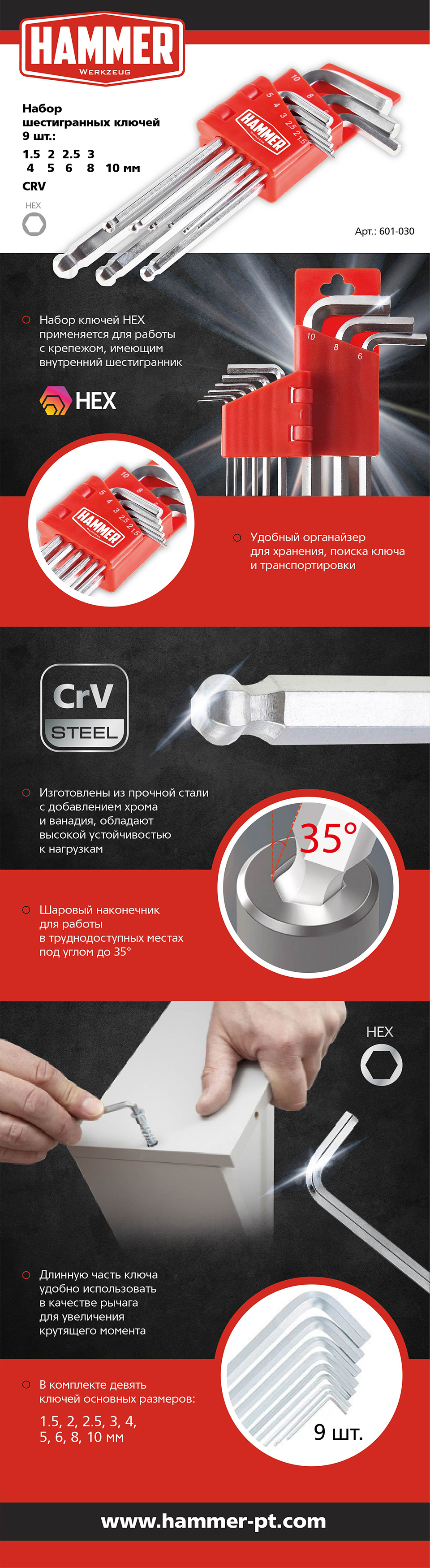 Набор ключей HEX применяется для работы с крепежом, имеющим внутренний шестигранник. Длинную часть ключа удобно использовать в качестве рычага для увеличения крутящего момента. В комплекте девять ключей основных размеров: 1,5; 2; 2,5; 3; 4; 5; 6; 8 и 10 мм.