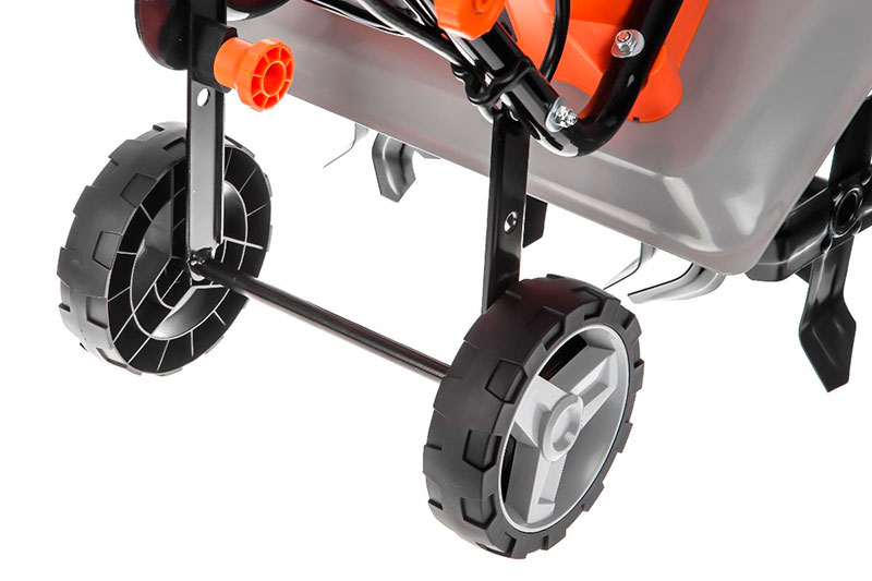 - Культиватор установлен на 2 колеса. Легко перемещать по садовому участку в выключенном состоянии.